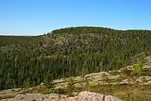 Sin embargo, el bosque caducifolio sólo cubre 42 hectáreas, apenas más del 1,4% de la superficie del parque.[9] Por tanto, el bosque es principalmente de coníferas, característico de la ecorregión de la taiga escandinava y rusa.[S 15] Este bosque está formado principalmente por píceas (Picea abies), pero en la frontera con las zonas áridas, la especie principal es el pino silvestre (Pinus sylvestris).[V 1] Los pinos dominan porque los incendios forestales son menos frecuentes que antes, ya que el abedul y el pino silvestre son las primeras especies que vuelven a crecer después de un incendio.[H 7] Parece que los incendios se produjeron de forma natural a lo largo de la historia, pero no ha habido ningún incendio desde hace dos siglos, ya que los humanos luchan activamente contra su propagación.[H 7] La edad máxima de los árboles del bosque es de 100 años, pero algunos pinos han llegado a los 500 años, siendo especialmente inaccesibles y, por tanto, salvados de los madereros.[H 7] Sin embargo, en los últimos 100 años, el bosque ha recuperado parcialmente la riqueza que caracteriza a los bosques antiguos.[H 8]