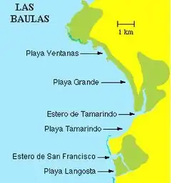 El Parque Nacional Marino Las Baulas de Guanacaste es un parque nacional de Costa Rica y un Sitio Ramsar. Se encuentra ubicado en el cantón de Santa Cruz de la provincia de Guanacaste, dentro de la bahía de Tamarindo del Golfo de Papagayo, entre los distritos de Cabo Velas y Tamarindo,[3] a 8 km de la comunidad de Matapalo y a 20 km de Tamarindo vía terrestre y 5 km vía estero. Comprende entre otras áreas geográficas los cerros Morro y El Hermoso; las playas Carbón, Ventanas, Grande y Langosta; los manglares San Francisco, Tamarindo y Ventanas, y las islas Capitán y Verde (fluvial).[4] Tiene una extensión de 175 km².[3] De estos, 7.7 corresponden al sector terrestre (3,3% del área del parque), de los cuales 2,2% es terreno público (manglares y 50 metros de playa inalienables), y 1,1% son terrenos privados expropiables.[2][5] El sector marino corresponde a 171.6 km² (96.8% del área del parque),[2][3] o 12 millas náuticas.[3] Pertenece al Área de Conservación Tempisque, administrada por el Sistema Nacional de Áreas de Conservación (SINAC).[6]
