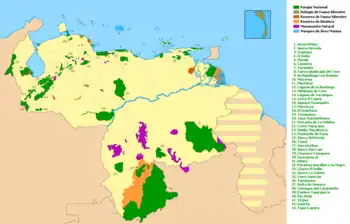 En total hay 44 parques nacionales y 36 monumentos naturales, que equivalen al 21,76% del territorio venezolano, y están bajo la administración del Instituto Nacional de Parques (INPARQUES). El parque nacional Jaua - sarisariñama fue absorbido al decretar el parque nacional indígena popular Caura en el año 2017.