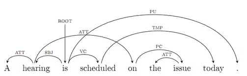 Otro método para realizar análisis sintáctico o parsing es utilizando gramáticas de dependencias, que surgen como una alternativa a las estructuras de frases.[3] En términos generales estas gramáticas definen una relación de dependencia entre cada elemento de una construcción (por lo general son oraciones pero también pueden ser solo frases) y su "cabeza" (o head ).[4] Estos elementos pueden ser palabras, tokens, lemas o incluso signos de puntuación. Adicionalmente se denomina a un elemento 0 o "raíz" (root) a la cabeza del constituyente principal, generalmente el verbo principal de la oración. Es importante no confundir dependencias con constituyentes, ya que las relaciones de dependencia generan pares únicos y ordenados.