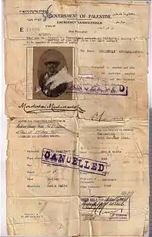 ![]() La portada de un pasaporte del Mandato de Palestina. | ||