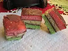 El pastel arcoíris es un dulce hecho con capas de colores brillantes de bizcocho con almendra, mermelada de albaricoque o frambuesa, y recubierto de chocolate.[1][2][3][4]