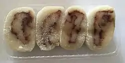 Kue nagasari Es un popular pastel de plátano indonesio que puede ser preparado utilizando plátano, harina de alubia mung o harina de arroz, leche de coco y azúcar.