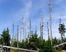Los efectos de las actividades humanas a menudo cambian la predisposición de los bosques a daños por efectos abióticos y bióticos. Por ejemplo las propiedades del suelo pueden ser alteradas por el uso de maquinaria pesada.