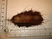 Los huevos son fusiformes y asalmonados y la larva presenta un color similar en su primer estadio, pero luego es blanquecina. A lo largo de la vida de la larva se suceden nueve estadios distintos en los que el individuo crece hasta alcanzar los 9 cm de longitud desde los menos de 10 mm que mide al salir del huevo.[5][6] Debido al prolongado tiempo de desarrollo necesario para su crecimiento, el ciclo biológico de Paysandisia archon puede ser anual o bianual, dependiendo del momento de eclosión del huevo, que influye en si la larva necesitará una temporada o dos para completar su crecimiento.[1][5][4] El huevo es depositado por la hembra sobre la palmera que funciona como planta nutricia, cerca de la corona, y posteriormente la larva penetra en su tronco para alimentarse y crecer. Las larvas son xilófagas y construyen largos túneles en el tronco de la palmera, lo que puede llegar a matar a la planta, y además pueden comportarse como caníbales para defender su territorio.[4] La forma en que la larva pupa y después eclosiona es similar a la de la familia Sesiidae, pues la exuvia queda en el orificio de salida del tronco.[1]