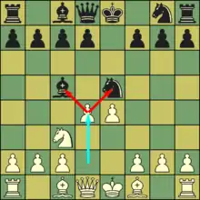 Si un peón se encuentra en la quinta fila y un peón adversario de una columna adyacente mueve dos escaques en su primer movimiento, es posible realizar la captura como si el peón adversario hubiese movido solo un escaque. Este movimiento es al paso y solo se puede realizar en la jugada siguiente a la que el peón adversario movió dos escaques.[19]
