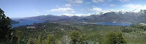 ![]() Península Llao Llao entre los lagos Moreno (abajo) y Nahuel Huapi (arriba). | ||