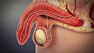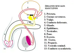 La uretra es una vía común para el paso de la orina y del semen, atraviesa el cuerpo esponjoso y termina en un orificio conocido con el nombre de meato urinario, el cual se encuentra en el extremo del glande. El esperma (hasta ese punto aún no se denomina semen) es producido en los testículos y almacenado en el epidídimo. Durante la eyaculación, el esperma es propulsado hacia los vasos deferentes. Los fluidos son agregados por las vesículas seminales. Los vasos deferentes desembocan en los conductos eyaculatorios, los cuales se unen a la uretra dentro de la próstata. Esta última y las glándulas bulbouretrales (también conocidas con el nombre de «glándulas de Cowper») adhieren secreciones y, por último, el semen es expulsado a través del orificio del pene.