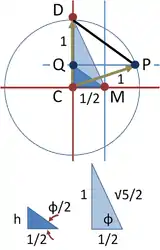 Para determinar la longitud de este lado, se representan debajo del círculo los dos triángulos rectángulos DCM y QCM. Utilizando el teorema de Pitágoras y dos lados, se halla la hipotenusa del triángulo mayor como . El lado h del triángulo menor se halla entonces utilizando la fórmula del semiángulo: