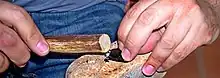 - La primera es sujetar el núcleo entre las rodillas, con la plataforma de percusión hacia arriba y la cara de extracción hacia afuera. Se coloca el extremo del puntero en el lugar donde queremos extraer la hoja y golpearlo decididamente con un percutor de asta que actúa como una maza. Es un sistema por el que consiguen buenos productos: hojas u hojitas alargadas y de tamaño mediano y muy estandarizado, pero con una fuerte curvatura general.