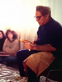 - Extracción de hojas sujetando el núcleo en el suelo por medio de mecanismos fijadores de madera y usando bastones-compresores con palanca apoyados en el abdomen. La postura del artesano es sentada y agarrando el bastón por el extremo opuesto, tirando de él hacia arriba. Así, la palanca ataca el núcleo con una fuerza superior a los 300 kg. Con este sistema, aún en fase de investigación, se han llegado a obtener hojas de más de 25 centímetros.