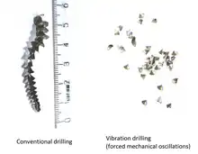 Los primeros estudios sobre el taladrado por vibración comenzaron en los años 50 (Pr. V.N. Poduraev, Universidad Bauman de Moscú). El principio principal consiste en generar vibraciones u oscilaciones axiales, además del movimiento de avance de la broca, para que las virutas se rompan y se eliminen fácilmente de la zona de corte.