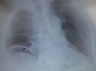 ![]() Aire libre bajo el diafragma derecho desde un intestino perforado. | ||