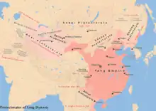 ![]() Territorio de la dinastía Tang y sus cambios a lo largo de la historia | |||||||||||||||||||||||||||||||||||||