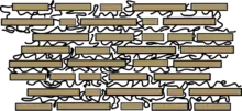 Estructura de las capas de nácar, en las que las placas de aragonito están separadas por biopolímeros, como quitina, lustrina y proteínas similares a la seda.