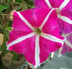Petunia × hybrida ("petunia") es el nombre científico con el que se designa a todos los híbridos habitualmente cultivadas que derivan de los cruzamientos entre Petunia integrifolia de Brasil y de Petunia axillaris de Argentina. Se trata de plantas perennes, cultivadas como anuales, de no más de 30 a 50 cm de altura. Presenta flores de diversos colores, tamaños, ondulaciones y texturas de los pétalos.[1][2]