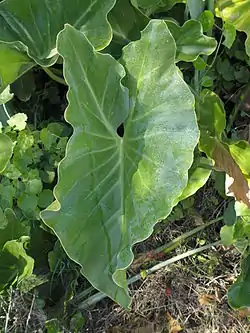 Es una planta trepadora, rastrera o hemiepífita, de hojas muy grandes, verde-glaucas, de borde entero, de 20 a 56 cm de largo por 20 a 44 cm de ancho; con peciolos de 40 a 90 cm; estípite 1 metro de altura y entre 5 y 15 cm de diámetro, erecto o a veces tendido, con largas raíces adventicias de hasta 2 cm de diámetro. Inflorescencias erectas, monoicas, en espádices. Espata externamente verde oscura; interior purpúreo. El fruto es una baya de 8 mm, naranja o roja.[8]