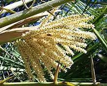 Las plantas son unisexuales y los floretes aparecen en la parte superior del tallo. Los floretes masculinos son de un color sucio, de amarillo pálido y se caen después de la floración; las femeninas son pequeños, globosos y de color amarillo-verde.[3] Esta especie tiene oblongos frutos comestibles, de color naranja (cuando está madura), de 2,5 cm de diámetro. El fruto se produce en grandes racimos colgantes y contienen una semilla cada una.[3]