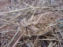 La lagartija cornuda texana, también conocida como lagarto cornudo, camaleón o camaleón texano (Phrynosoma cornutum) pertenece a la familia Phrynosomatidae.[3]