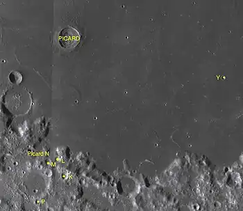 Por convención estos elementos son identificados en los mapas lunares poniendo la letra en el lado del punto medio del cráter que está más cercano a Picard.[4]