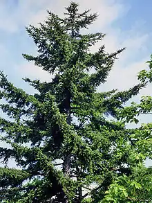 Es un árbol con la corona piramidal que alcanza los 25-35 metros de altura con hojas lineales de color verde. Las semillas en una piña cilíndrica.