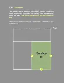 | Falta de pie | Pisar o entrar en la zona de no volea mientras se volea una pelota, o, al servir, no mantener ambos pies detrás de la línea de fondo con al menos un pie en contacto con el suelo o el piso cuando la pala entra en contacto con la pelota. | [18]:xxii, 61, A-11 |