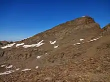 Vista del pico del Veleta desde la cima del Mulhacén. Abajo se observa la Laguna de la Caldera, situada en la cara oeste del Mulhacén.