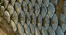 La epidermis es muy sencilla, con una capa superficial de queratina.[11] La epidermis de los peces dispone de glándulas que secretan una sustancia llamada mucus que le proporciona protección, lubrica la superficie y disminuye la resistencia al roce con el agua.[12] La dermis es más compleja y está dividida en los dos estratos de tejido conjuntivo fibroso y laxo. En la dermis se originan las escamas y se encuentran los cromatóforos, por ejemplo con melanina, que dan el color a la piel.[4][11]
