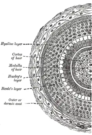 Se estructura en una cubierta externa escamosa llamada cutícula, una capa celular intermedia conocida como córtex y una interna de células cúbicas llamada médula.