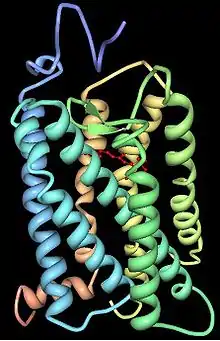 Tanto la rodopsina como los pigmentos de color son proteínas conjugadas. Se incorporan a las membranas bajo la forma de proteínas transmembrana. Las concentraciones de estos pigmentos fotosensibles en los discos son tan grandes que ellos mismos constituyen aproximadamente el 40% de toda la masa del segmento externo de un cono o un bastón.