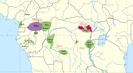 Los pigmeos del Congo hablan lenguas de las familias lingüísticas de Níger-Congo y Sudán Central. Se supone que los pigmeos alguna vez hablaron su propio idioma(s), pero, «al vivir en simbiosis con otros africanos en tiempos prehistóricos, adoptaron idiomas que pertenecen a estas dos familias».[9] Ha habido una mezcla significativa entre los bantúes y los pigmeos. Hay por lo menos una docena de grupos pigmeos, a veces no relacionados entre sí, suman al menos 350,000 en la cuenca del Congo. Los más conocidos son los Mbenga (Aka y Baka) de la cuenca occidental del Congo que hablan lenguas bantú y ubangiana; los Mbuti (Efe y otros) del Bosque de Ituri, que hablan lenguas bantúes y sudanés central, y los Twa de los Grandes Lagos, que hablan bantu Ruanda-Rundi. Todos los pueblos pigmeos atestiguados hablan idiomas de estas tres familias lingüísticas, y solo tres pueblos, los Aka, Baka y Asua, tienen su propio idioma.[10] Si bien existe una escasez de sitios arqueológicos excavados en África Central que podrían respaldar esta hipótesis,[11] los estudios genéticos han demostrado que las poblaciones pigmeas poseen antiguos linajes divergentes de ADN Y (especialmente los haplogrupos A y B) en altas frecuencias en contraste con sus vecinos (que poseen principalmente haplogrupo E).[12]