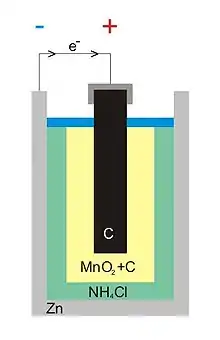 El contenedor de una pila seca de zinc-carbono es un recipiente metálico de zinc. Éste contiene una capa de pasta acuosa de cloruro de amonio, NH4Cl, con cloruro de zinc, ZnCl2, separada por una capa de papel de una mezcla de polvo de carbón y óxido de manganeso (IV) (MnO2), que está alrededor de una varilla de carbono (grafito).[7]