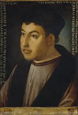 Francisco Fernández de Córdoba y Mendoza, por Fernando del Rincón (ca. 1460-?). Sería el padre de Antonio del Rincón, también pintor de los reyes, pero de identificación problemática. Otros de la época serían Francisco Chacón y el maestro Miguel (uno de los "pintores extranjeros en la corte").[26] |