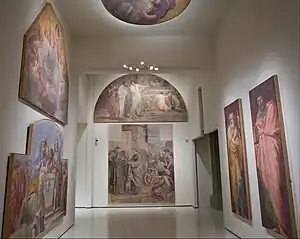Los frescos fueron arrancados de las paredes y se traspasaron a lienzo cuando esta iglesia dejó de gozar de patrocinio español a mediados del siglo XIX, y terminaron repartidas entre Madrid y Barcelona. El grupo de siete pinturas de Madrid se conserva en el Museo del Prado, y las nueve de Barcelona se incorporaron al fondo del MNAC en 1902 como Depósito de la Real Academia Catalana de Bellas Artes de San Jorge para ingresar en la colección en 1906.[1]