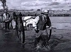 «A pesar de nuestros esfuerzos por mantener limpios los ejes y cajas que eran de madera, el polvo encontró su camino para dañarlos, y junto con el peso extra que cargaban los carros, los ejes se rompían en el hombro. Se recurrió a toda clase de soluciones para remediar el creciente mal, pero con un éxito variable. Algunos envolvieron sus ejes con cuero obtenido de sus botas; otros con estaño sacrificando sus platos, ollas, baldes o de su equipo hechos de ese metal. Además de estos inconvenientes, faltó con que lubricarlos apropiadamente. Nada que sirviera a este propósito tuvimos en absoluto.»