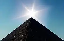 El piramidión de la Pirámide Negra del faraón Amenemhat III, descubierto en 1990, se encuentra en Dahshur, a unos 40 kilómetros de El Cairo. En una de sus caras tiene un grabado de una esfera solar alada esculpida en relieve y debajo hay dos ojos sagrados que representan los ojos del faraón que está mirando el sol desde el interior de la pirámide; bajo ellos hay grafiados tres signos que significan nefer (perfección o belleza), así como un jeroglífico con el nombre y el título del faraón.[24]