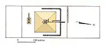 El recinto, orientado en dirección norte-sur[1] forma un gran rectángulo de quinientos cincuenta metros de largo por casi doscientos de ancho. Reducido al estado de ruinas, el complejo parece haber sido rediseñado durante la edificación, lo que vuelve difícil el entendimiento de en qué orden se realizaron las diferentes modificaciones. De hecho, las excavaciones revelaron dos muros, el primero enmarcando de cerca la pirámide y el segundo más oblongo, similar al muro del complejo de Zoser. Esto señala un cambio en el plano mismo del complejo. Le da al plano un aspecto más conforme al modelo, ubicando la pirámide de forma descentrada en relación con el centro del área sagrada, de la misma forma que Imhotep concibió la de su soberano más hacia el norte. La parte norte del primer recinto se conserva sobre sus primeros cimientos y reproduce de manera análoga las puertas dobles selladas indicando que la verdadera y única entrada al complejo debía encontrarse en otro sitio. Aparejado sobre cimientos regulares de calcáreos finos, este muro tiene muchas semejanzas con el del recinto de Zoser excepto por su plano y sus proporciones. Este muro utiliza además bloques más grandes de cincuenta centímetros de altura mientras que los del recinto de Zoser tenían solo veinticinco centímetros.