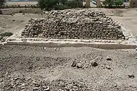 La pirámide, cuyas ruinas alcanzan apenas metro y medio de altura, tenía en origen tres o quizá cuatro alturas, y fue construida con bloques de piedra caliza unidos con mortero de barro, arena y cal; su orientación es paralela al curso del río, 20° NO.