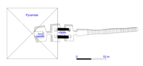 - Ante la pirámide, al este, existe un pequeño templo funerario con un pilono de entrada, que suele estar ricamente decorado con relieves. Aquí la persona muerta es nombrada y representada en escenas del inframundo o junto a deidades. Todo el complejo piramidal a veces está rodeado por un muro.