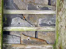 Las baldosas de pizarra se utilizan a menudo para pavimentos interiores y exteriores,[21] escaleras,[22] pasarelas[23] y revestimiento de paredes.[24] Las baldosas se instalan y colocan sobre mortero y se rejuntan a lo largo de los bordes. A menudo se utilizan selladores químicos en las baldosas para mejorar la durabilidad y el aspecto,[25] aumentar la resistencia a las manchas,[21] reducir la eflorescencia y aumentar o reducir la suavidad de la superficie. Las baldosas suelen venderse calibradas, lo que significa que la superficie posterior está rectificada para facilitar la instalación.[25] Los suelos de pizarra pueden ser resbaladizos cuando se utilizan en lugares exteriores expuestos a la lluvia. Las baldosas de pizarra se utilizaron en la construcción de edificios en el Reino Unido en el siglo XIX (aparte de los tejados) y en zonas de canteras de pizarra como Blaenau Ffestiniog y Bethesda (Gales) todavía hay muchos edificios construidos totalmente con pizarra. La pizarra también puede colocarse en las paredes para crear una membrana antihumedad rudimentaria. Los pequeños recortes se utilizan como calzos para nivelar las vigas del suelo. En las zonas donde abunda la pizarra, también se utiliza en trozos de diversos tamaños para construir muros y setos, a veces combinada con otros tipos de piedra. En los hogares modernos, la pizarra se utiliza a menudo como posavasos.