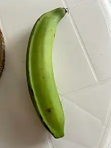 El plátano verde es el fruto inmaduro de la musa balbisiana, utilizado ampliamente en gastronomía. Generalmente tiene más almidón que azúcar.[1]Los plátanos verdes se consumen cocidos o fritos.[2] Según la región o país se conocen como plátanos, verdes o plátanos verdes.[3][4][5]