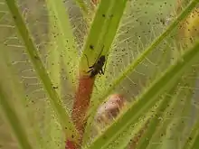 Otras plantas que se consideran como protocarnívoras tienen tricomas pegajosos sobre alguna superficie, como el escapo floral y las yemas de Stylidium y Plumbago,[13] las brácteas de Passiflora foetida, y las hojas de Roridula. Los tricomas de Stylidium, que aparecen debajo de la flor, se han adaptado para capturar y matar pequeños insectos desde que fueron descubiertas hace varios siglos, pero su objetivo sigue siendo ambiguo. En noviembre de 2006, el Dr. Douglas Darnowski publicó un artículo describiendo la digestión activa de proteínas cuando entran en contacto con un tricoma de una especie de Stylidium creciendo mediante una técnica de tejidos asépticos vegetales, demostrando que la planta, en lugar de los microbios de superficie, era la fuente de producción de la proteasa.[14] Darnowski afirma en ese documento que dada esta evidencia, las especies de Stylidium son llamadas carnívoras correctamente, aunque con el fin de cumplir la definición estricta de carnívora que se requiere para demostrar que son capaces de absorber los nutrientes que provienen de la presa y que esta adaptación le da a las plantas algunas ventajas competitivas.