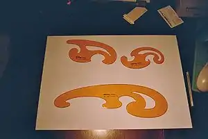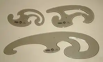 ![]() El juego típico está compuesto por tres curvas. La de arriba a la izquierda se usa para dibujar hipébolas, la de la derecha para elipses y la de abajo para parábolas. |