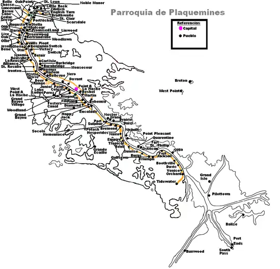 La Parroquia de Plaquemines posee un total de ciento cuatro localidades. A continuación se puede apreciar un cuadro mencionando cada una de ellas: