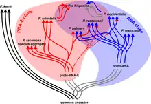 - Asimismo, P. rzedowskii]' de Nueva León es un mosaico genético, y puede haberse originado de una hibridación anterior dentro del clado ANA, entre P. occidentalis s.l. más meridional (P. palmeri) y P. mexicana s.l., o sus ancestros.[6] Estos últimos son compartidos con P. gentryi, la especie PNA-E más cercana al área del clado ANA y a las poblaciones del norte/interior de P. mexicana s.l. Esto indica que ya el ancestro común de P. rzedowskii y P. occidentalis s.l. había estado en contacto con un miembro del clado PNA-E.