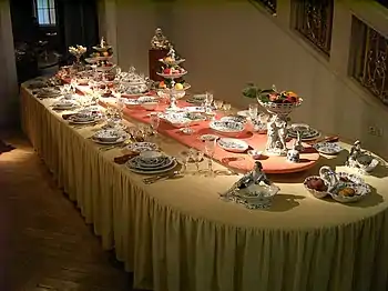 La colocación de los platos en la mesa se hace de la siguiente manera. En primer lugar se colocan los bajoplatos o platos de decoración. Sobre ellos, se sitúan los platos llanos y sobre ellos, los platos hondos o platos de aperitivo, más pequeños que los anteriores. El platillo del pan se coloca a la izquierda, alineado con las copas. Asimismo, la etiqueta aconseja no colocar dos platos iguales juntos (es decir, dos hondos o dos llanos) y no apoyar directamente los platos hondos sobre la mesa.[8]