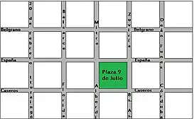 1582-1665: «Plaza Mayor» o «Grande» 1665-1884: «Plaza de Armas» 1884-actualidad: «Plaza 9 de Julio» | |