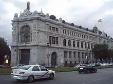 La esquina suroccidental de la plaza está presidida por la sede central del Banco de España, inaugurada en 1891, nueve años después de que el rey Alfonso XII colocara la primera piedra. El edificio fue proyectado por Eduardo Adaro y Severiano Sainz de la Lastra, quienes contaron con un presupuesto aproximado de 15.300.000 pesetas. También intervinieron en las obras Aníbal Álvarez Bouquel, Alejandro Herrero y Bernardo Asins, entre otros. Este último fue el autor de las puertas de hierro.