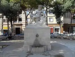 Uno de los elementos destacados de la plaza es la conocida como Fuente del Viejo o del Chato, cuyo nombre hace referencia a la estatua neoclásica que la preside, un anciano cuya nariz está rota. Fue esculpida en 1818 por Damià Campeny para formar parte de una fuente monumental que originalmente estaba ubicada en la plaza del Teatro, junto a la Rambla. La figura fue trasladada a la plaza de Sants con motivo de la reurbanización de 1975.[11]