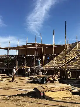 Es una obra arquitectónica inteligente, dotada de una estructura flexible, ingeniosa y eficiente para la zona sísmica. La estructura es un esqueleto entretejido y amarrado en perfecta armonía y provisto de gran estabilidad estructural la cual es viable con un bajo costo cíclico de construcción. Está formada estructuralmente por un entramado de madera de varios tipos de los que se dan en la región y de acuerdo a las características del sistema, ya sea para absorber esfuerzos de tracción a través de polines y largueros, como para transmitir las fuerzas de compresión al terreno mediante horcones. Este sistema estructural se une entre sí con cordeles y sogas de ixtle. La obra se inicia una vez que se ubica el centro del terreno y se traza el círculo que define al ruedo, el cual tiene un diámetro de sesenta metros y la superficie construida cerca de los tres mil metros cuadrados. El área de graderías, construidas también en madera, tienen un área de dos mil m², lo que permite un cupo de aproximadamente cinco mil espectadores. Estas graderías están divididas en 70 secciones o tablados, los cuales pertenecen a 70 concesionarios distintos que son los que almacenan, construyen y posteriormente desmantelan la estructura. Las faldas son la cubierta de la plaza, las que están hechas de petate y se colocan en la parte baja de las gradas, así como en las escaleras de cada uno de las plateas. Para realizar esta obra, cada concesionario de tablado aporta cinco horcones, cinco soleras, tres latas largas, tres cortas, docena y media de tablas para platea, los asientos y los estribos, media docena de trancas para el ruedo, cuatro docenas de petates y seis sogas para amarrar.[6]